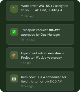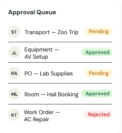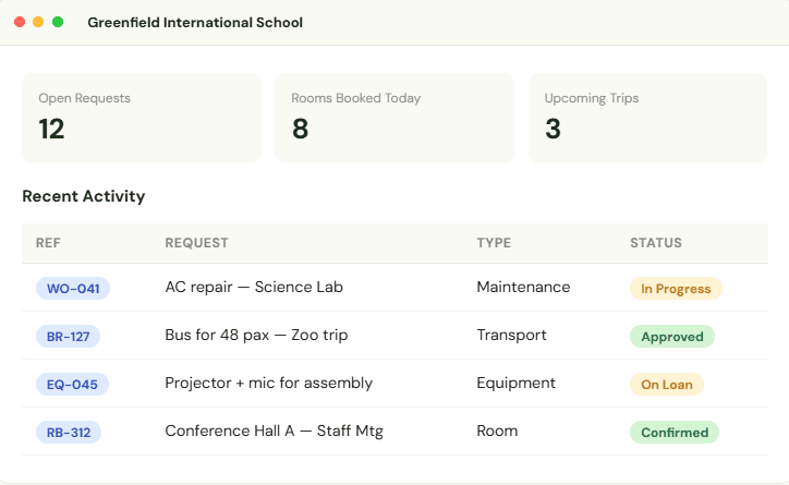 From maintenance requests to room bookings to transport coordination — manage every operational workflow across your campus. Teachers submit requests. Operations teams resolve them. Administrators see everything.