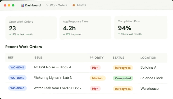 Manage work orders from request to resolution. Track assets, schedule preventive maintenance, and give your team full visibility into every task.